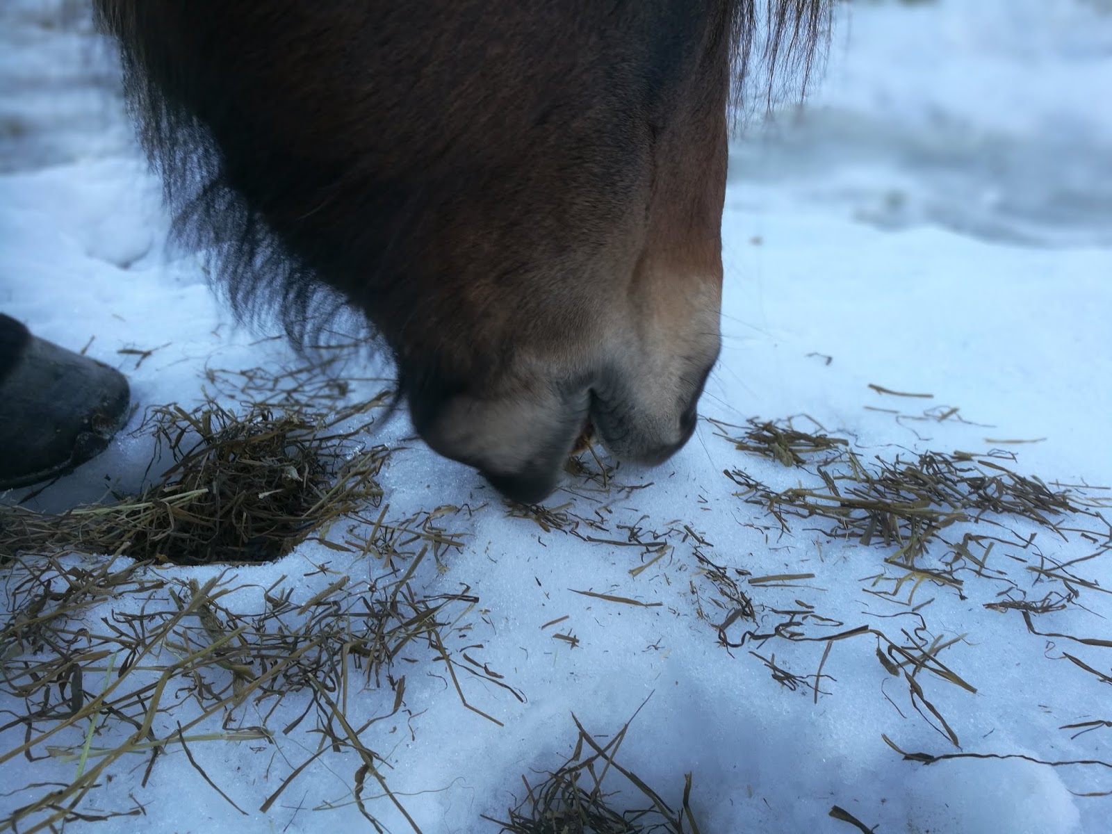 Onko siis järkevää annostella heinät yhteen kasaan, joka päivä samaan kohtaan vai olisiko syytä lähteä ruokkimaan mielikuvitus matkassa ja laittaa hevoset töihin ruokaansa etsiessään! Meillä jäistä maata ja hankea käytetään talvilaidunnuksen järjestämiseen siten että heinää ripotellaan ympäriinsä hangelle, paikkoja vaihdellen, kesällä hevoset laiduntavat ja tarvittaessa heinän muodossa annettava lisäruokinta toteutetaan samalla tavalla.